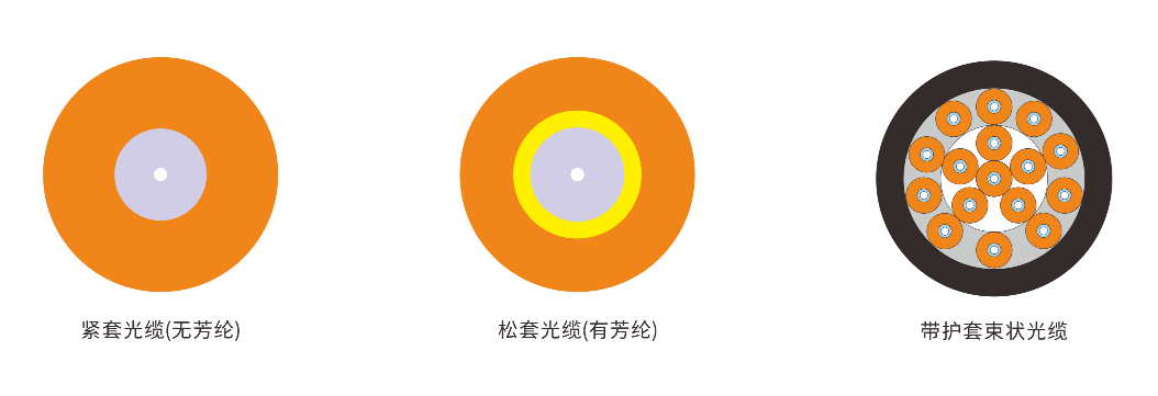 特種絞合光纜內(nèi)部為有芳綸松套光纜;集束光纜(帶護(hù)套束狀光纜)內(nèi)部為緊套光纖,可視應(yīng)用要求在緊套光纖之間填充kevlar纖維以增加光纜的抗拉性能。