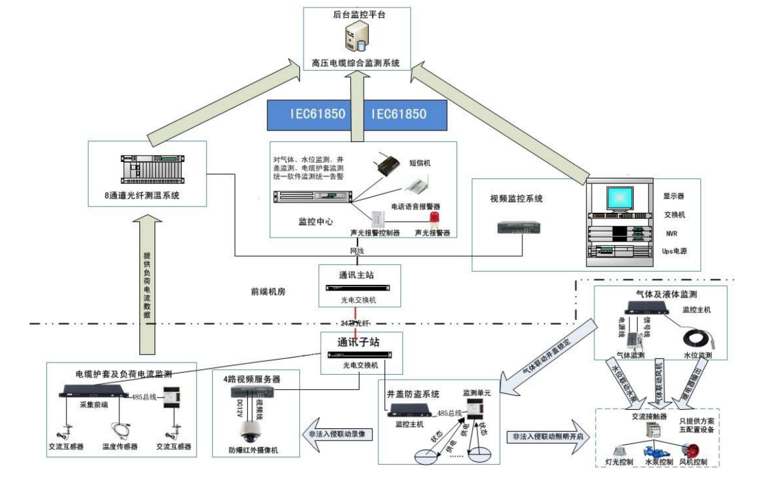 電纜隧道綜合監(jiān)控系統(tǒng)包含“電纜狀態(tài)監(jiān)測(cè)及載流量分析子系統(tǒng)”、"隧道環(huán)境監(jiān)測(cè)子系統(tǒng)”、“視頻監(jiān)控子系統(tǒng)”、“門(mén)禁井蓋監(jiān)測(cè)子系統(tǒng)”、“隧道輔助設(shè)備控制子系統(tǒng)”等五個(gè)系統(tǒng),可以對(duì)電纜隧道的運(yùn)行情況進(jìn)行全方位監(jiān)測(cè),在電纜事故和異常災(zāi)害發(fā)生時(shí),可以及時(shí)通過(guò)隧道內(nèi)各類(lèi)輔助設(shè)施和預(yù)警及應(yīng)急手段以有效控制事件影響范圍,確保電網(wǎng)安全穩(wěn)定、保證人身安全、減少經(jīng)濟(jì)損失。五個(gè)子系統(tǒng)集成在同一個(gè)監(jiān)控平臺(tái)上,統(tǒng)一顯示,統(tǒng)一管理,操作方便。