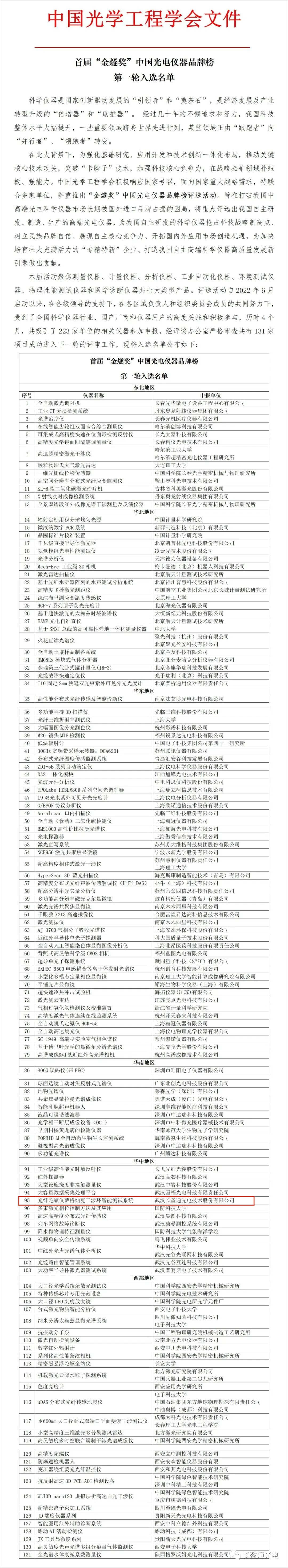 本屆活動(dòng)聚焦測(cè)量?jī)x器、計(jì)量?jī)x器、分析儀器、工業(yè)自動(dòng)化儀器、環(huán)境測(cè)試儀器、物理性能測(cè)試儀器和醫(yī)學(xué)診斷儀器共七大類(lèi)型產(chǎn)品。評(píng)選活動(dòng)自2022年6月啟動(dòng)以來(lái),在各級(jí)領(lǐng)導(dǎo)的支持下,在各區(qū)域負(fù)責(zé)人和組織委員會(huì)成員的共同努力下,受到了全國(guó)科學(xué)儀器行業(yè)、國(guó)產(chǎn)廠商和儀器用戶的高度關(guān)注和積極參與,歷時(shí)4個(gè)月,共吸引了223家單位的相關(guān)儀器參加申報(bào),經(jīng)評(píng)獎(jiǎng)辦公室嚴(yán)格審查共有131家項(xiàng)目成功入選下一輪的評(píng)審工作,附入選名單公布如下: