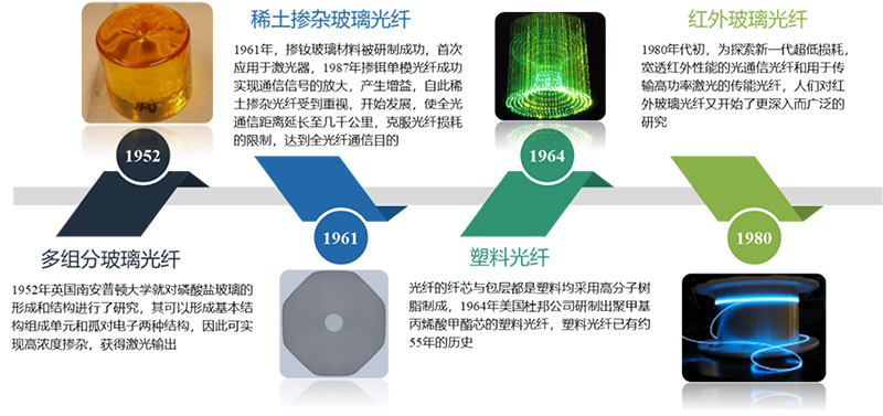 1952年英國南安普頓大學(xué)就對(duì)磷酸鹽玻璃的形成和結(jié)構(gòu)進(jìn)行了研究,磷酸鹽玻璃可以形成基本結(jié)構(gòu)組成單元和孤對(duì)電子兩種結(jié)構(gòu),因此可實(shí)現(xiàn)高濃度稀土摻雜,獲得激光輸出,該類光纖主要用作短距離的信號(hào)傳輸和圖像傳輸,且由于不同比例的材料成分制作出來的玻璃光學(xué)性質(zhì)不同,使得多組分玻璃的種類繁多,制造成本也比較低。目前主要的種類有:重金屬氧化物玻璃,氟化物玻璃、硫化物玻璃、碲酸鹽玻璃以及“肖特”體系玻璃等。圖5為特種光纖材料的發(fā)展歷程。